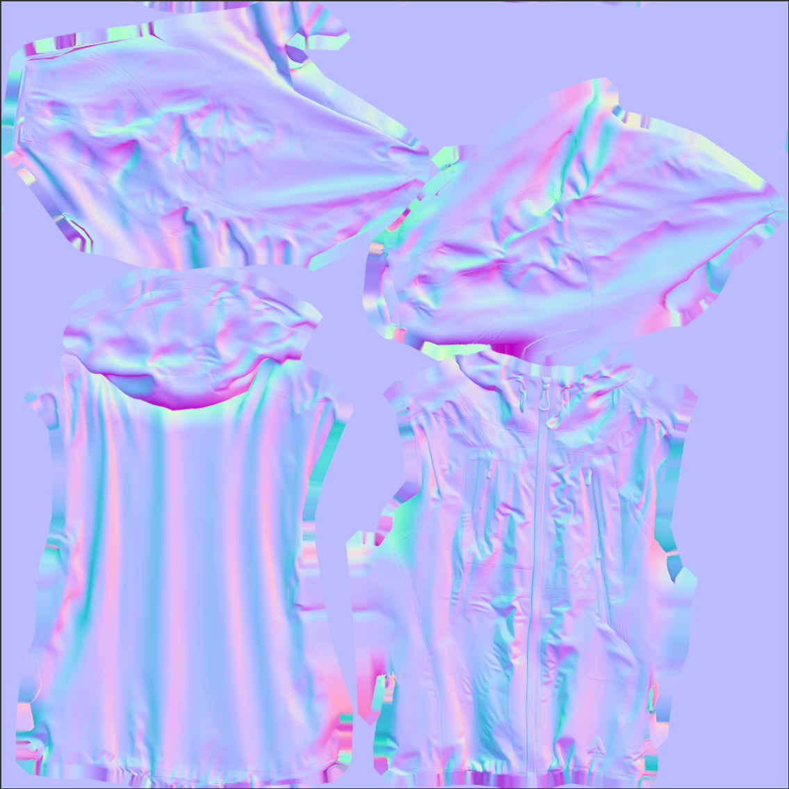 매장 모델링에 들어가는 의류들은 PBR 방식으로 제작되기 때문에 노말맵이 필요합니다. AI 툴에서 뽑은 텍스처에는 노말맵이 포함되어 나오지 않기 때문에, 노말맵을 위한 베이크는 기존의 방식대로 추출합니다. 민둥민둥한 연보라색 노말이 아닌 하이폴리곤의 정보를 가진 노말맵이 추출됩니다.