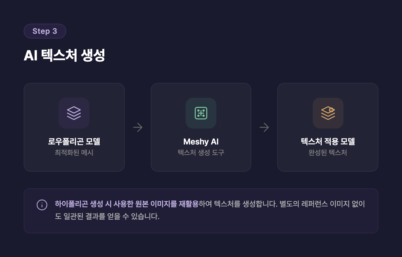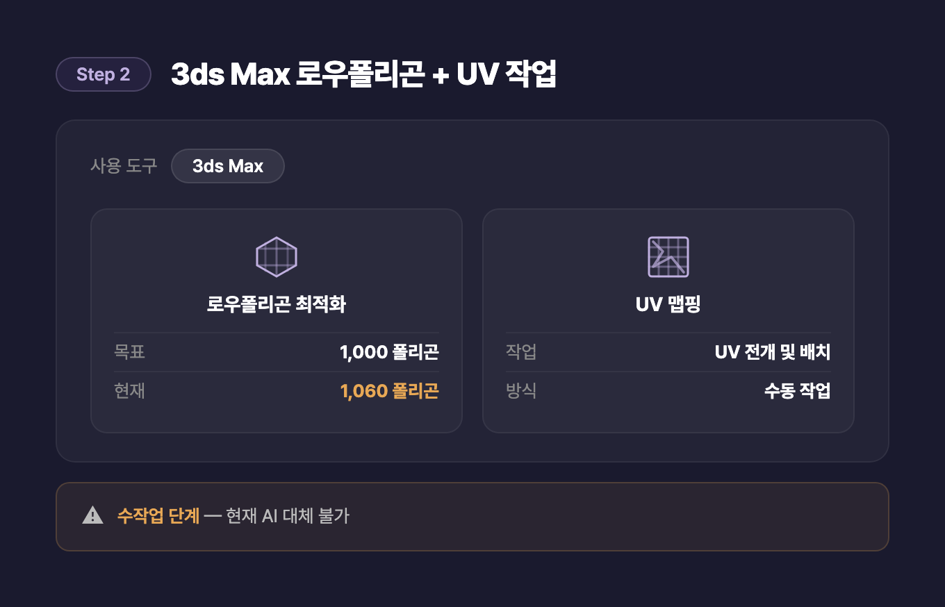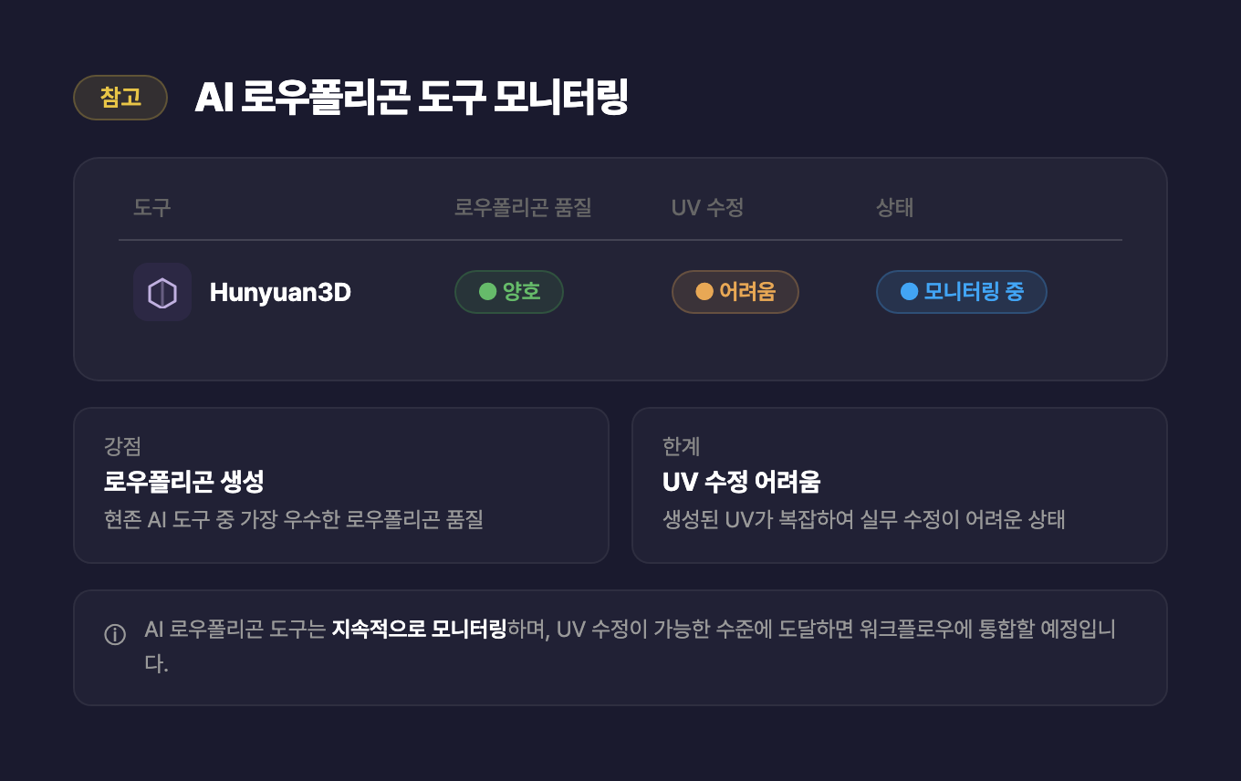 - Hunyuan3D 같은 대안 도구를 계속 모니터링하고 있다는 점이 중요합니다. 로우폴리곤까지 AI가 처리하게 되면 수작업 단계가 하나 더 줄어들 텐데, 그때를 대비한 확장 여지를 남겨둔 설계입니다.