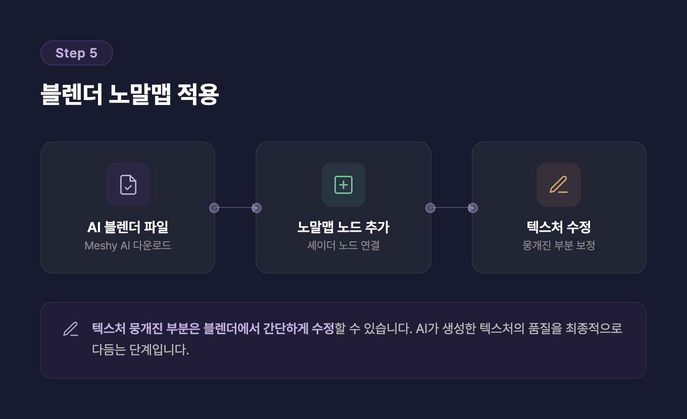 AI 툴에서 블렌더 파일을 다운받고 직접 뽑은 노말맵도 노드에 추가해줍니다. 텍스처가 뭉개진 부분은 블렌더에서 간단하게 수정했습니다.