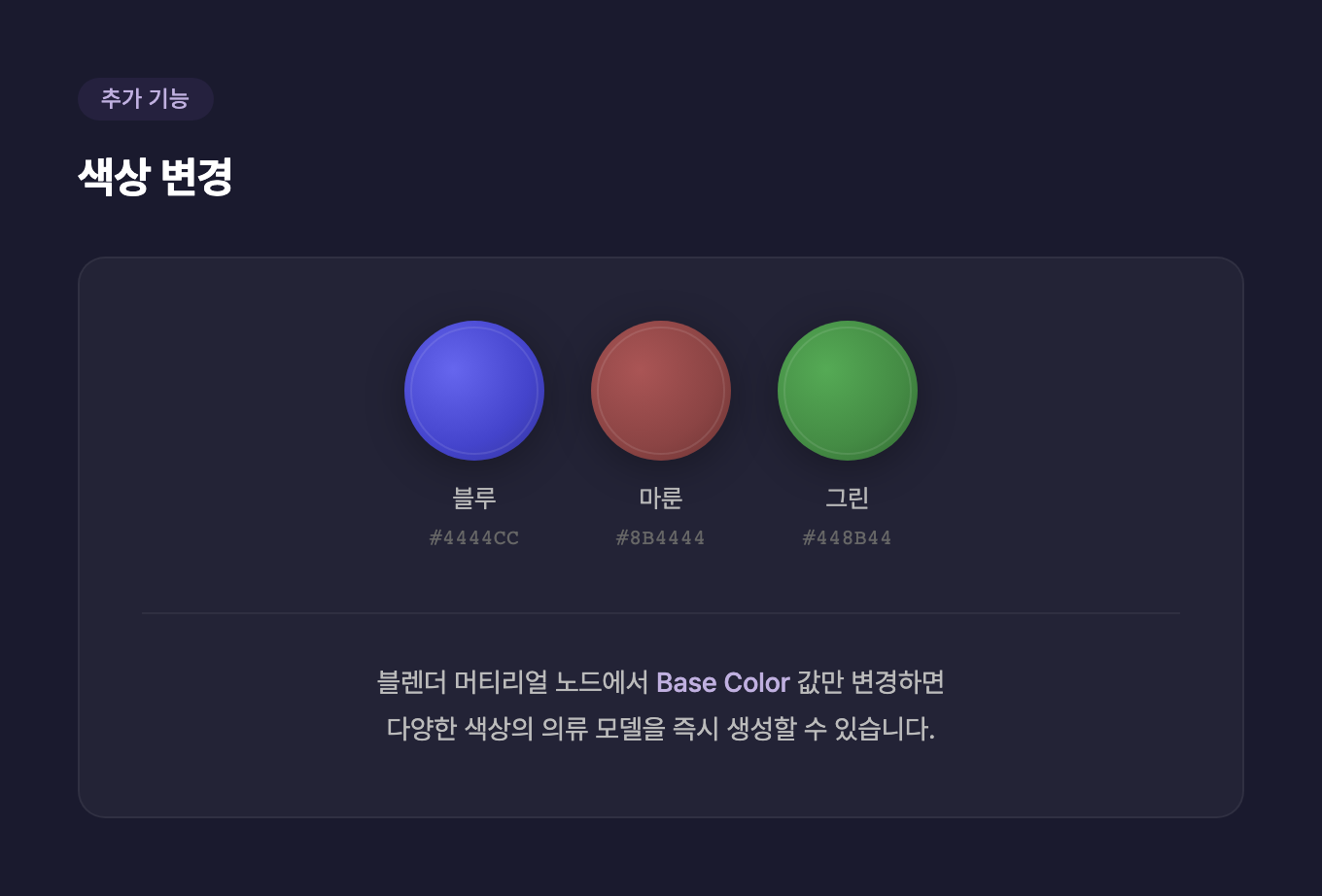 색상변경도 가능합니다. 블렌더 머티리얼 노드에서 Base Color 값만 변경하면 다양한 색상의 의류 모델을 즉시 생성할 수 있습니다.