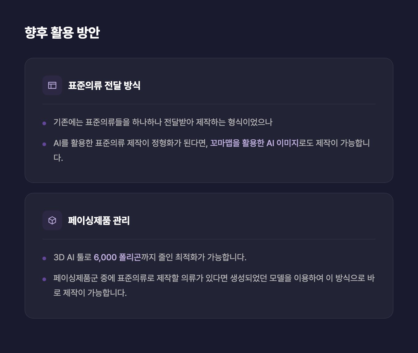 기존에는 표준의류를 하나하나 전달받아 만들었지만, AI 제작 프로세스가 정형화되면 꼬마맵에서 바로 AI 이미지로 제작할 수 있습니다.