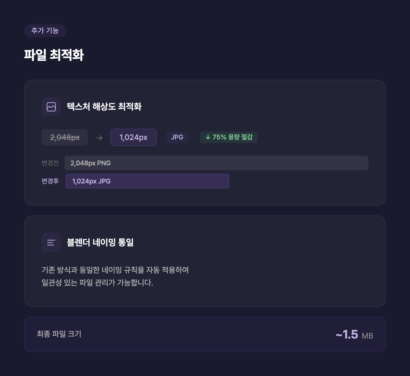 2048로 뽑힌 이미지들을 1024로 변경한 jpg 이미지로 교체해주면 파일 최적화도 가능합니다. 블렌더 네이밍도 기존의 방식과 통일시켜줄 수 있습니다.