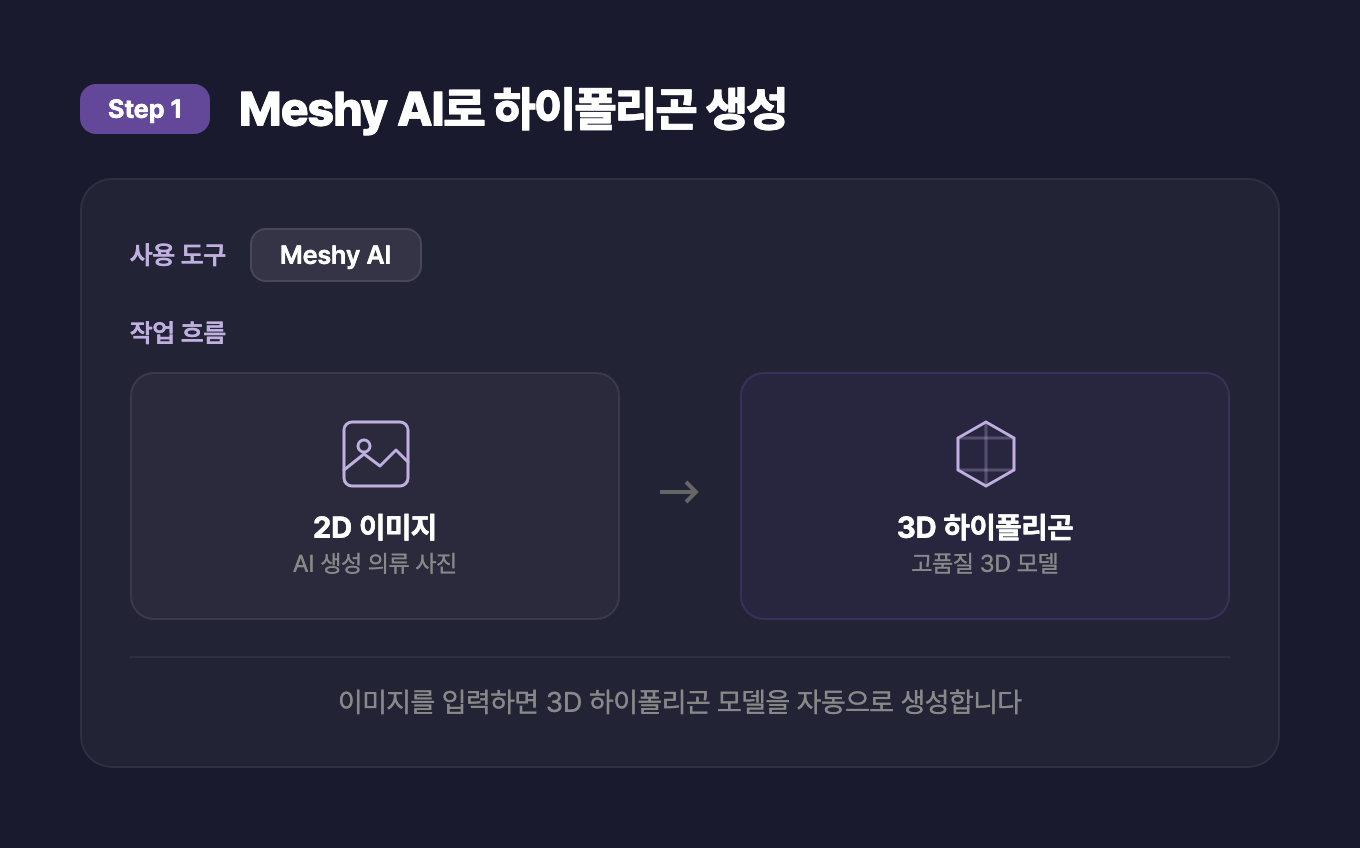 Meshy AI라는 3D AI 툴에 의류 이미지를 넣으면 하이폴리곤 모델을 자동으로 생성해줍니다.
