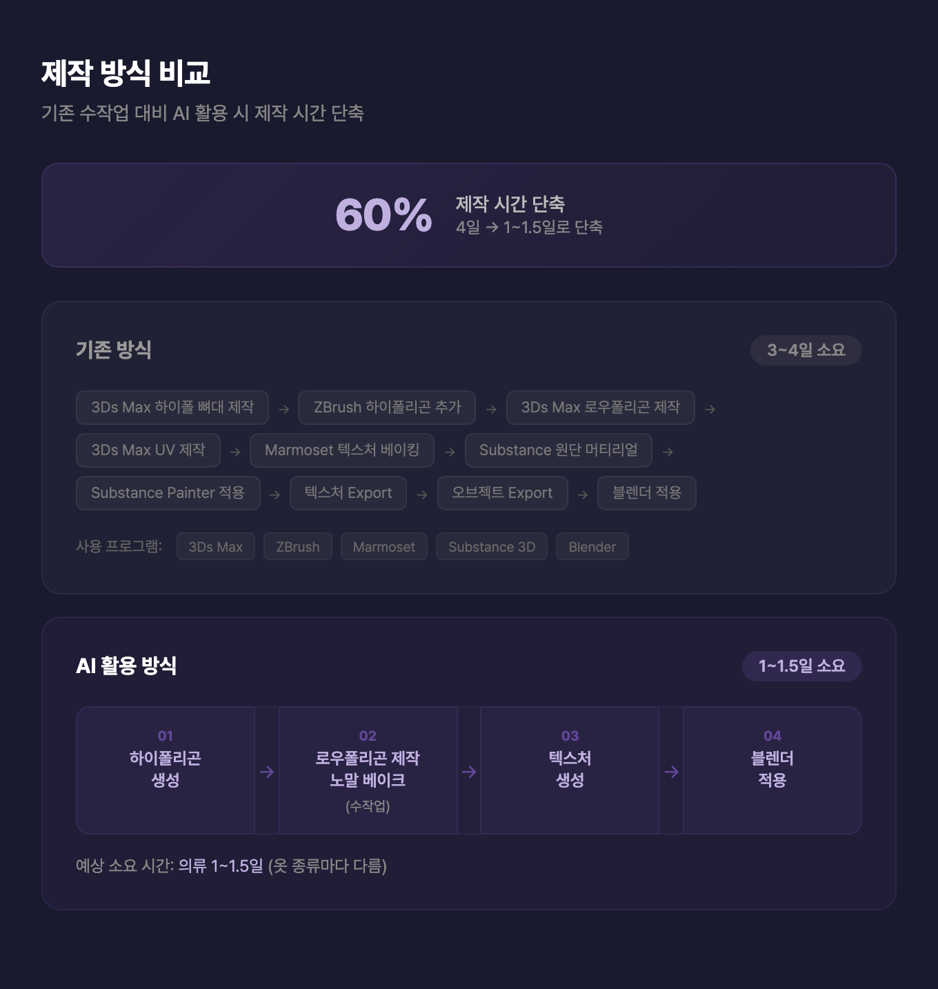 3D 표준의류를 하나 만들려면 3Ds Max에서 시작해 ZBrush, Marmoset, Substance 3D, Blender까지 — 5개 프로그램을 거치는 10단계 파이프라인을 밟아야 했습니다. 하이폴 뼈대 → 하이폴리곤 추가 → 로우폴리곤 → UV → 텍스처 베이킹 → 원단 메터리얼 → 텍스처 적용 → Export → 블렌더 적용. 3~4일이 걸리는 수작업 중심의 프로세스였습니다.