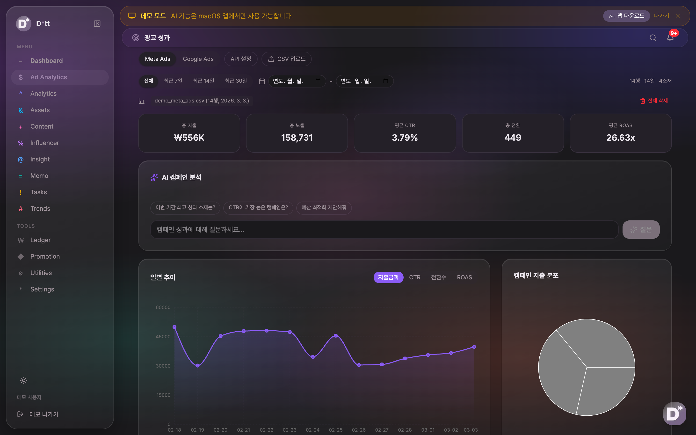 - 광고 성과 분석: Meta Ads, Google Ads 데이터를 연동하여 지출, 노출, CTR, 전환, ROAS 등 핵심 지표를 대시보드로 확인하고 AI가 캠페인을 분석