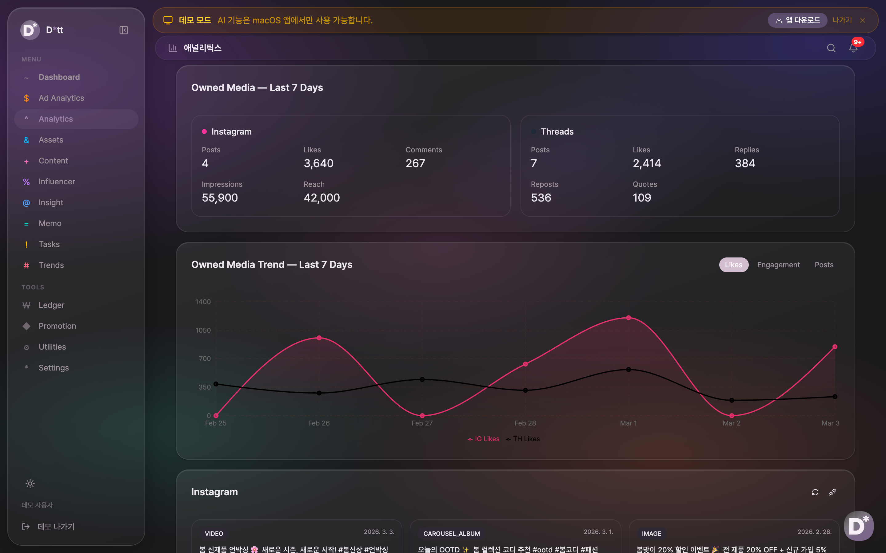 - 소셜 미디어 애널리틱스: Instagram, Threads 등 Owned Media의 팔로워, 좋아요, 댓글, 도달률을 실시간 집계하고 트렌드 추이를 시각화