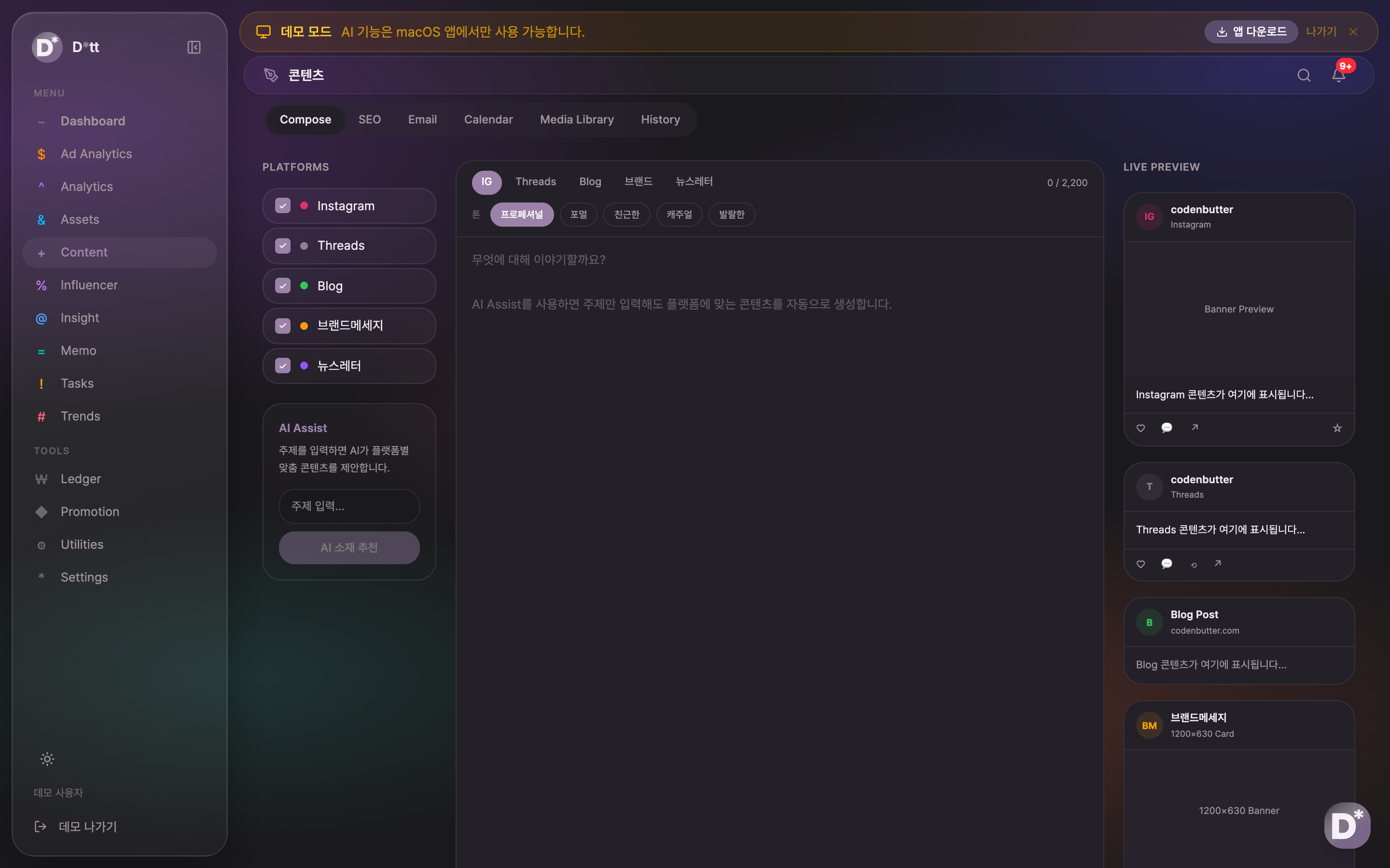 - AI 콘텐츠 생성: 주제를 입력하면 Instagram, Threads, Blog, 브랜드메세지, 뉴스레터 등 플랫폼별 맞춤 콘텐츠를 AI가 자동 생성하고 실시간 미리보기 제공
