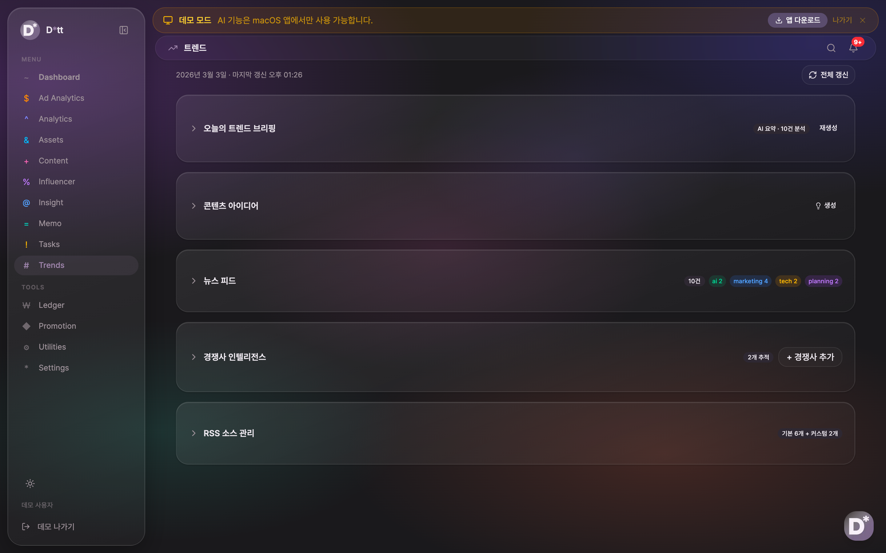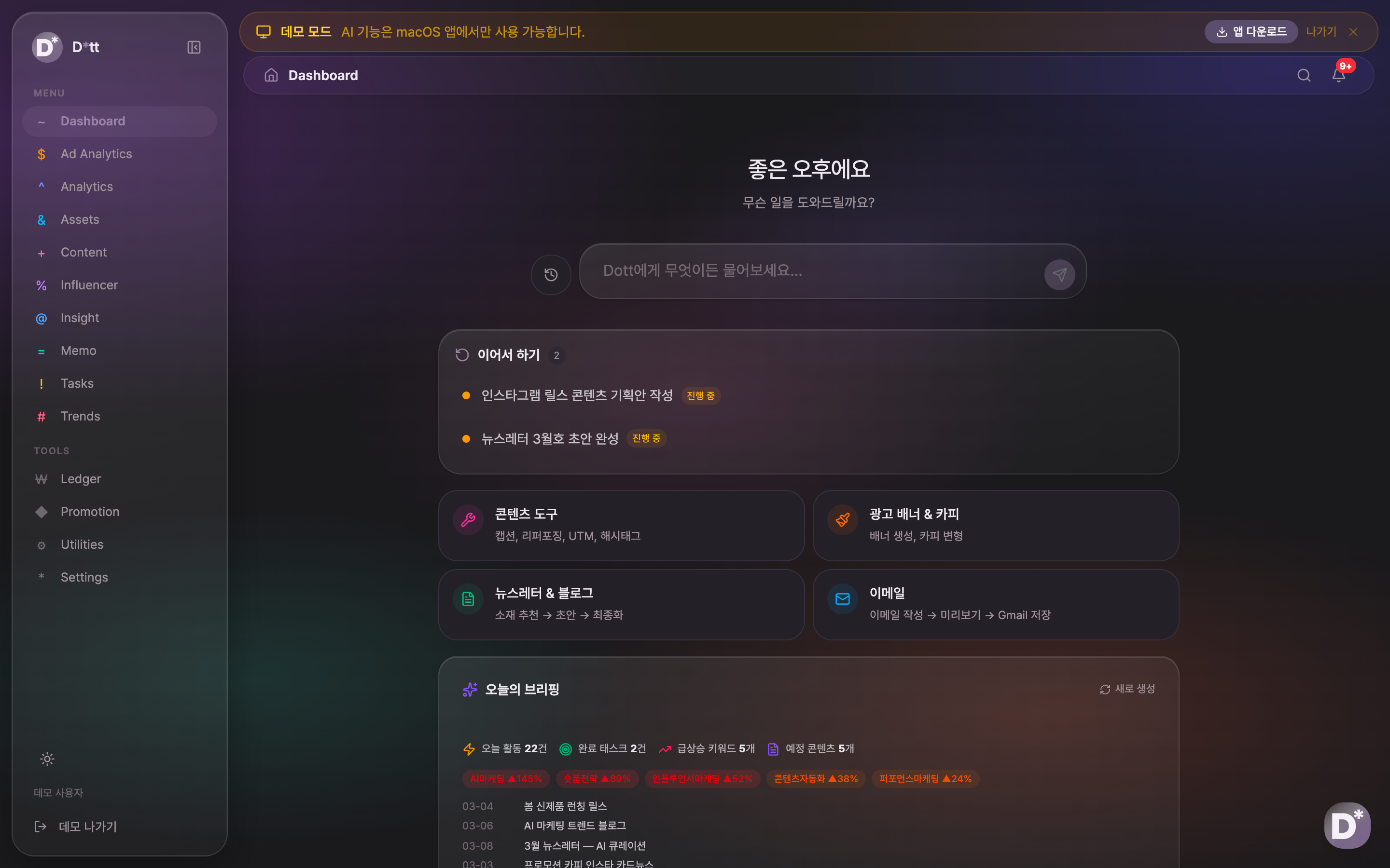 - 트렌드 브리핑: 매일 자동으로 업계 트렌드를 수집·분석하여 콘텐츠 아이디어, 경쟁사 인텔리전스, 뉴스 피드를 제공