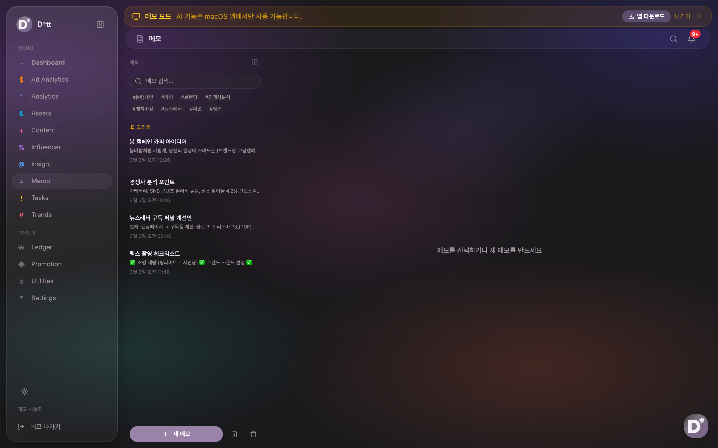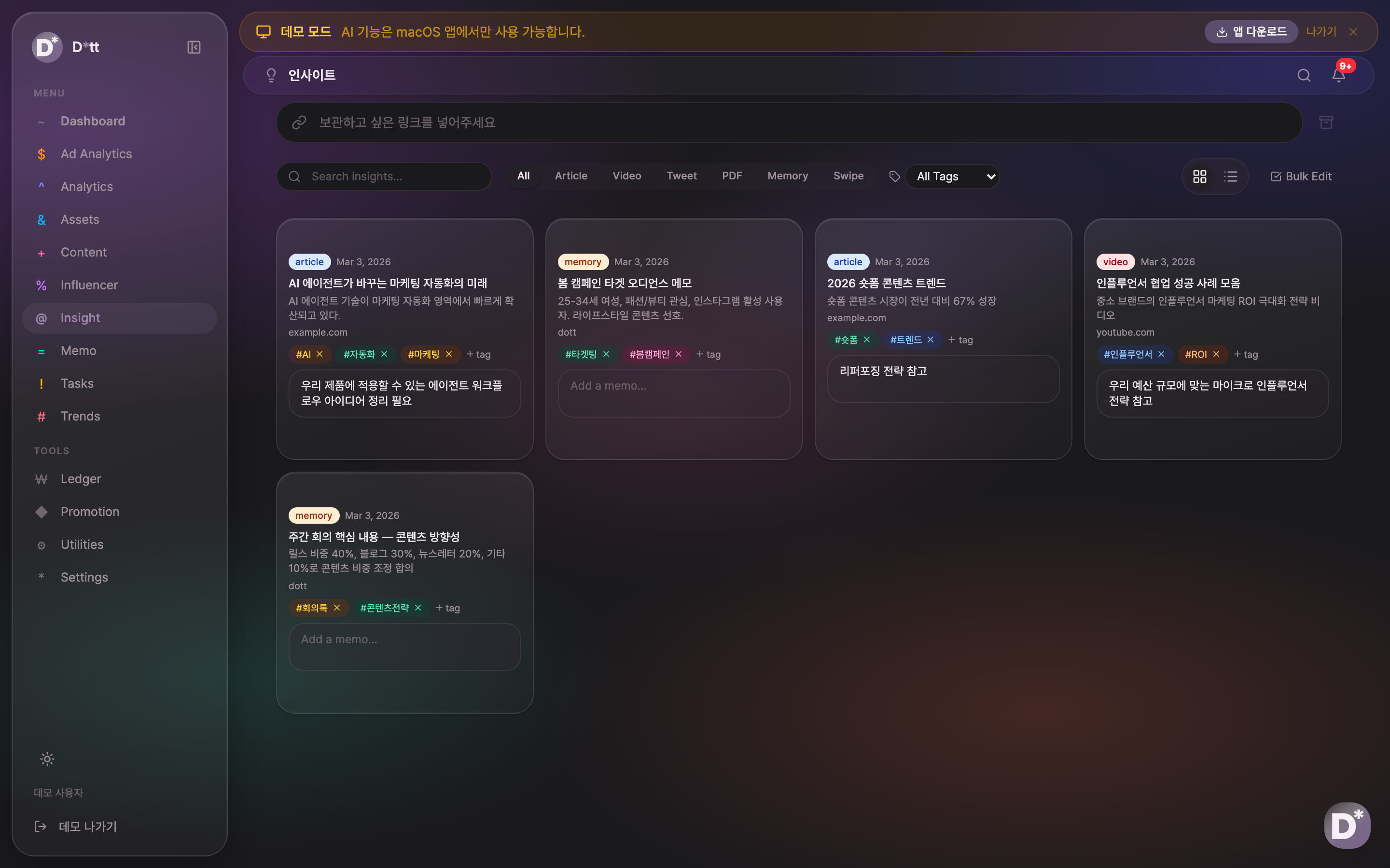 - 인사이트 & 메모: 마케팅 관련 아티클, 영상, 트윗 등을 태그 기반으로 저장하고, 캠페인 아이디어와 경쟁사 분석 메모를 빠르게 기록