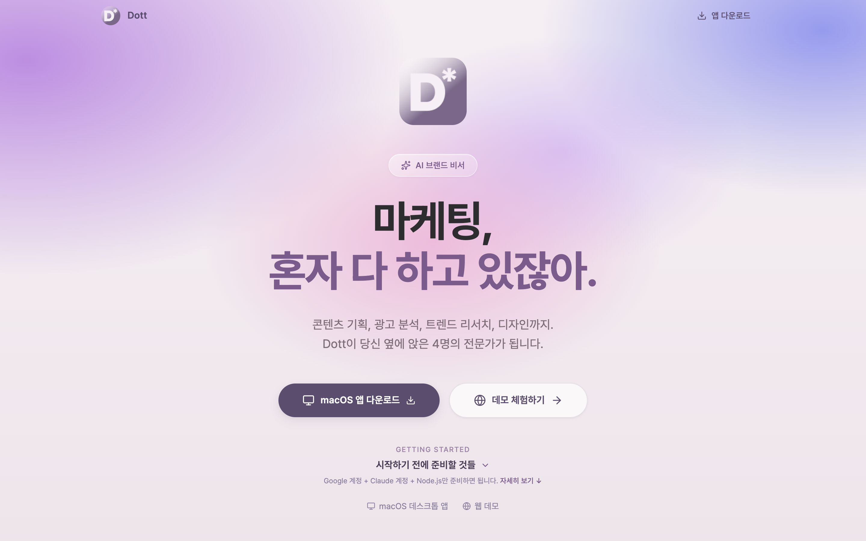 그래서 직접 만들었습니다. 마케팅 업무 전체를 하나로 묶는 브랜드 어시스턴트, Dott(닷). Electron + Next.js + Claude API로 macOS 트레이에 상주하며, 마케터의 실시간 어시스턴트 역할을 합니다.
