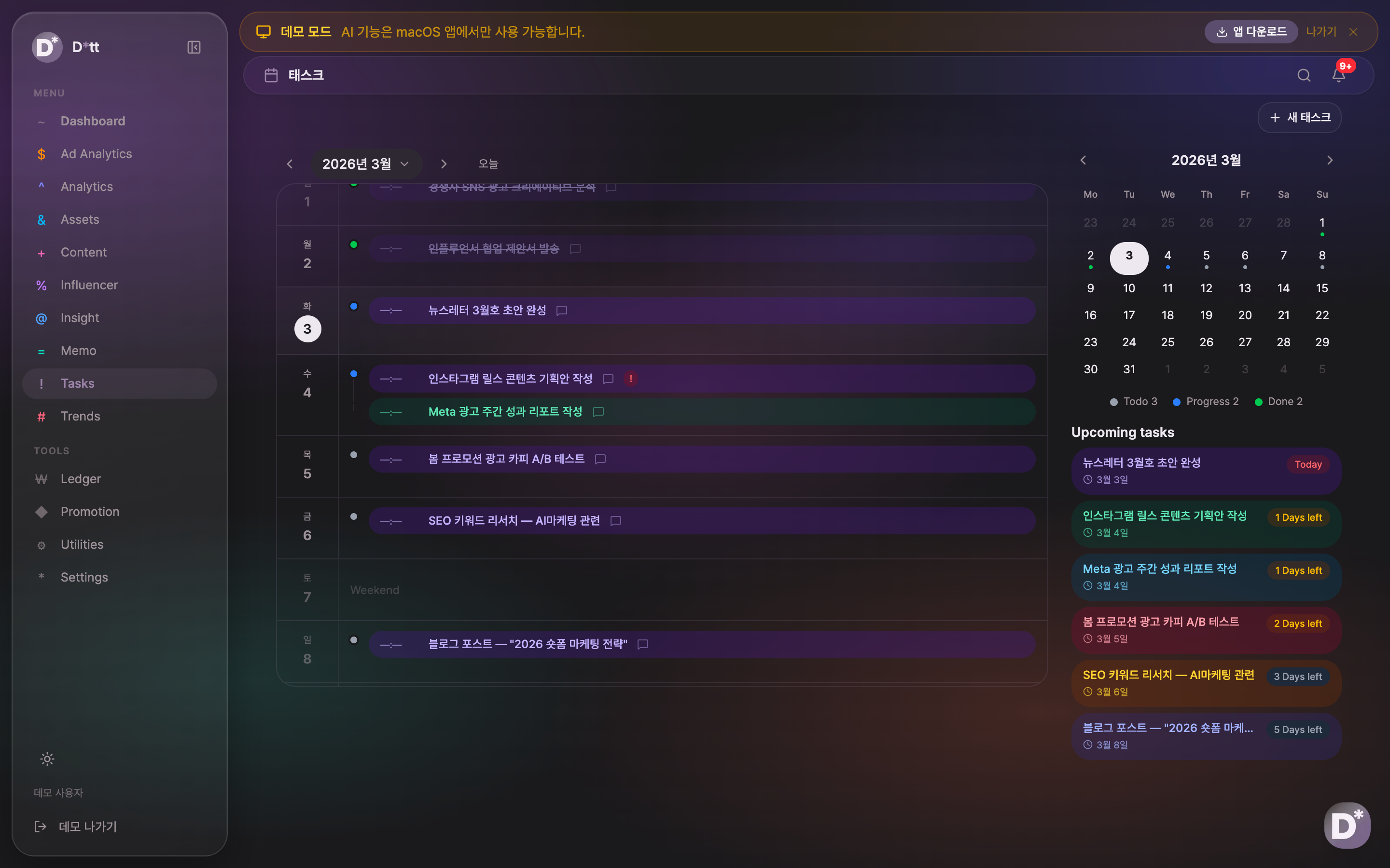 - 태스크 관리: 캘린더 기반 마케팅 태스크 관리로 콘텐츠 기획안 작성, 광고 리포트, SEO 리서치 등 일정을 체계적으로 관리