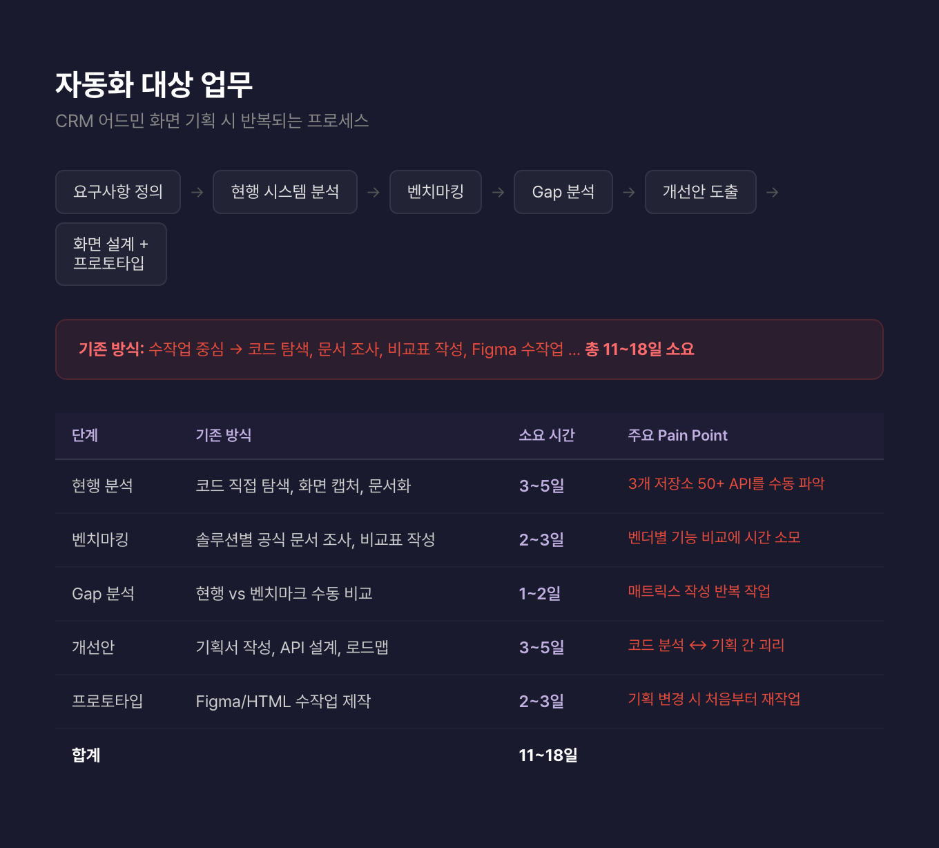 CRM 어드민 기획을 하려면 코드를 뒤지고, 문서를 조사하고, 비교표를 만들고, Figma로 화면을 그려야 했습니다. 한 건에 11~18일이 걸리는 구조였습니다.