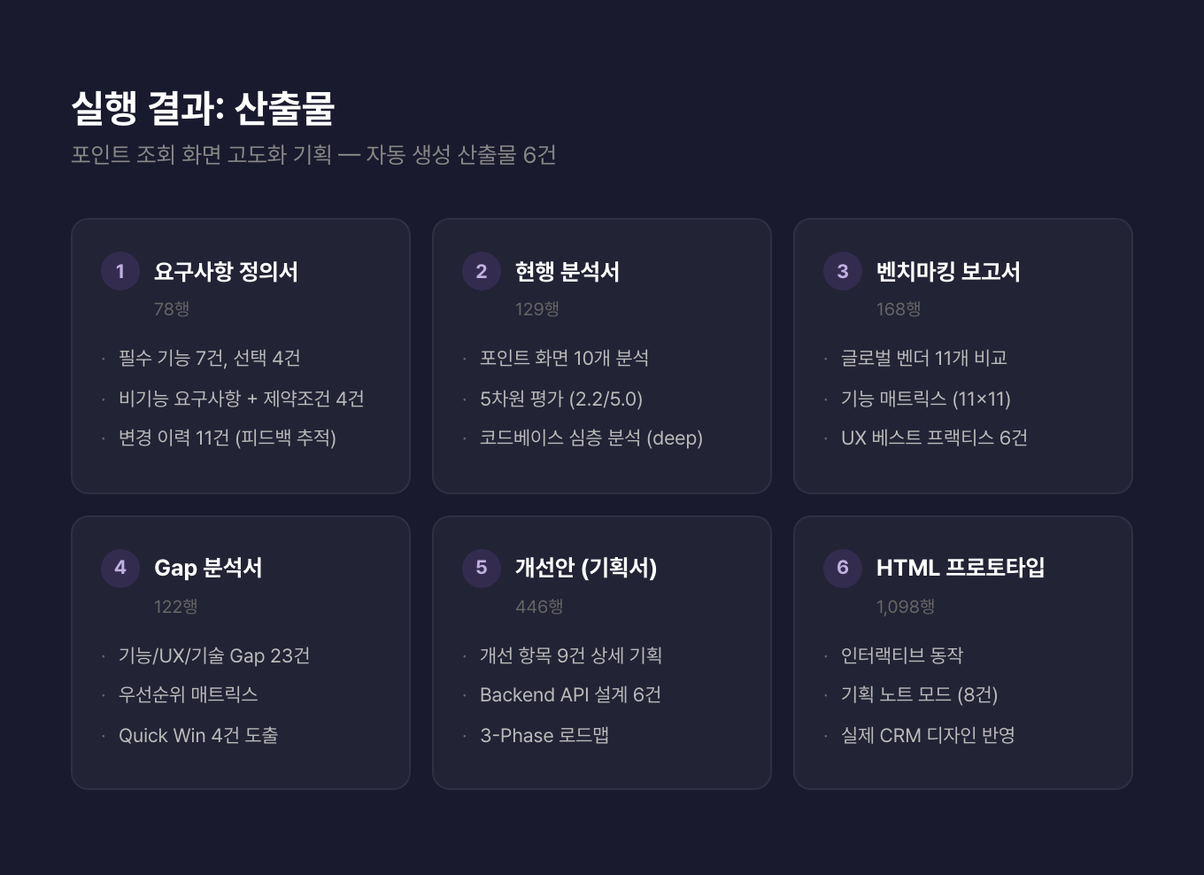 - 명령어 한 줄로 요구사항 정의서(78줄)부터 HTML 프로토타입(1,098줄)까지 나옵니다. 단순 자동화가 아니라 "기획 프로세스 자체를 에이전트화"한 것인데, 사람이 하던 판단 흐름을 파이프라인으로 재구성한 점이 인상적입니다.