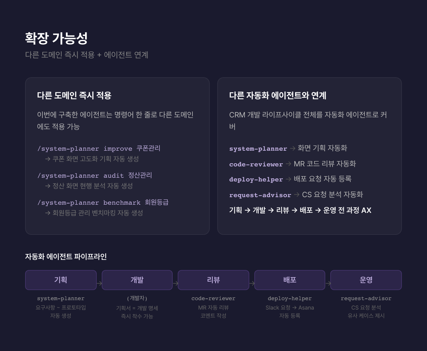 도메인명만 바꾸면 다른 화면에도 바로 적용할 수 있고, CRM 개발 전체를 에이전트로 커버하는 것도 가능합니다.