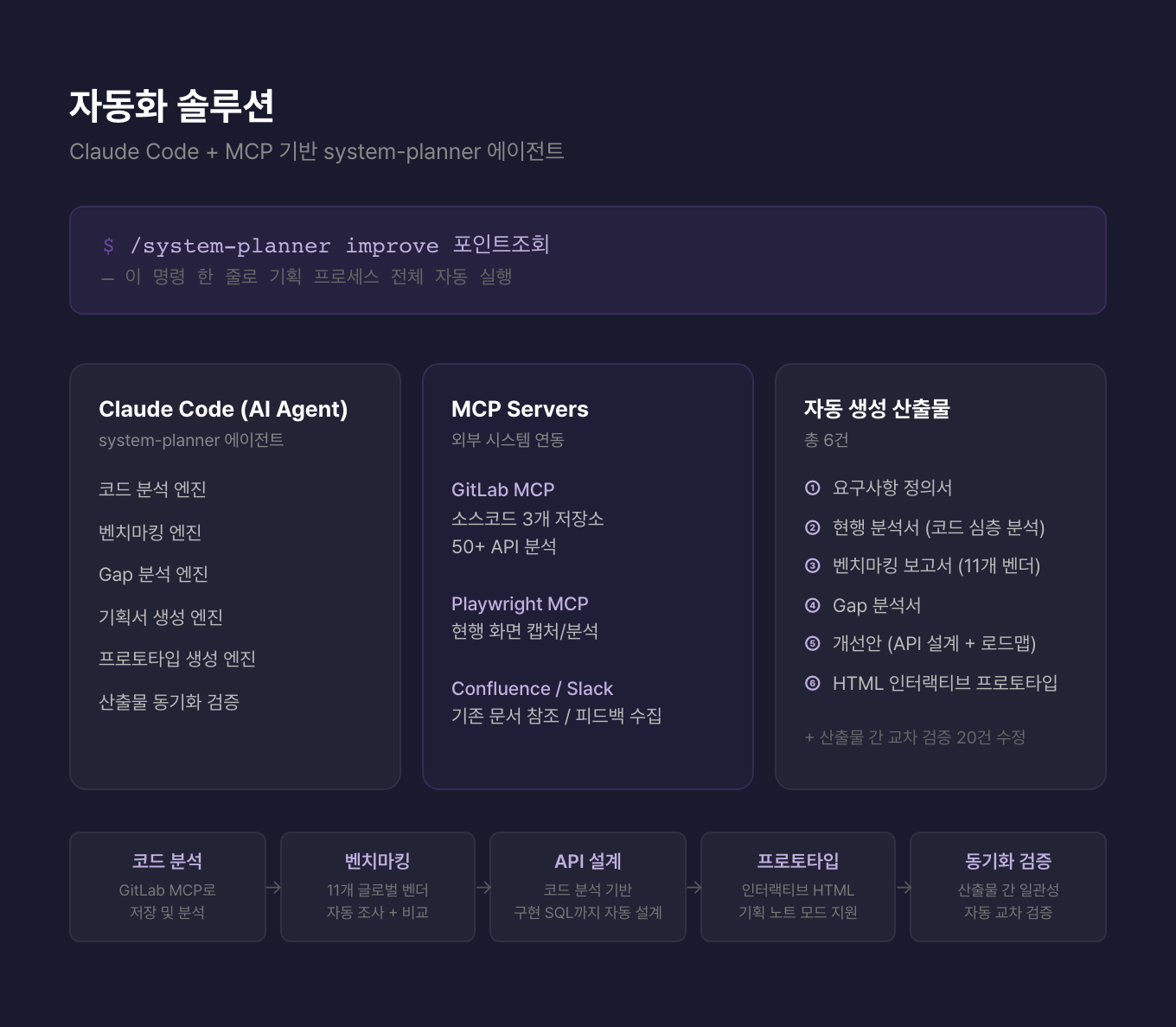 - GitLab·Playwright·Confluence·Slack MCP 5종을 연동해서 에이전트가 코드 분석(3개 레포, 50+ API), 화면 캡처, 문서 조사까지 직접 수행합니다. 교차 검증으로 20건의 불일치를 자동 감지·수정한 것은 품질 측면에서 주목할 부분입니다.