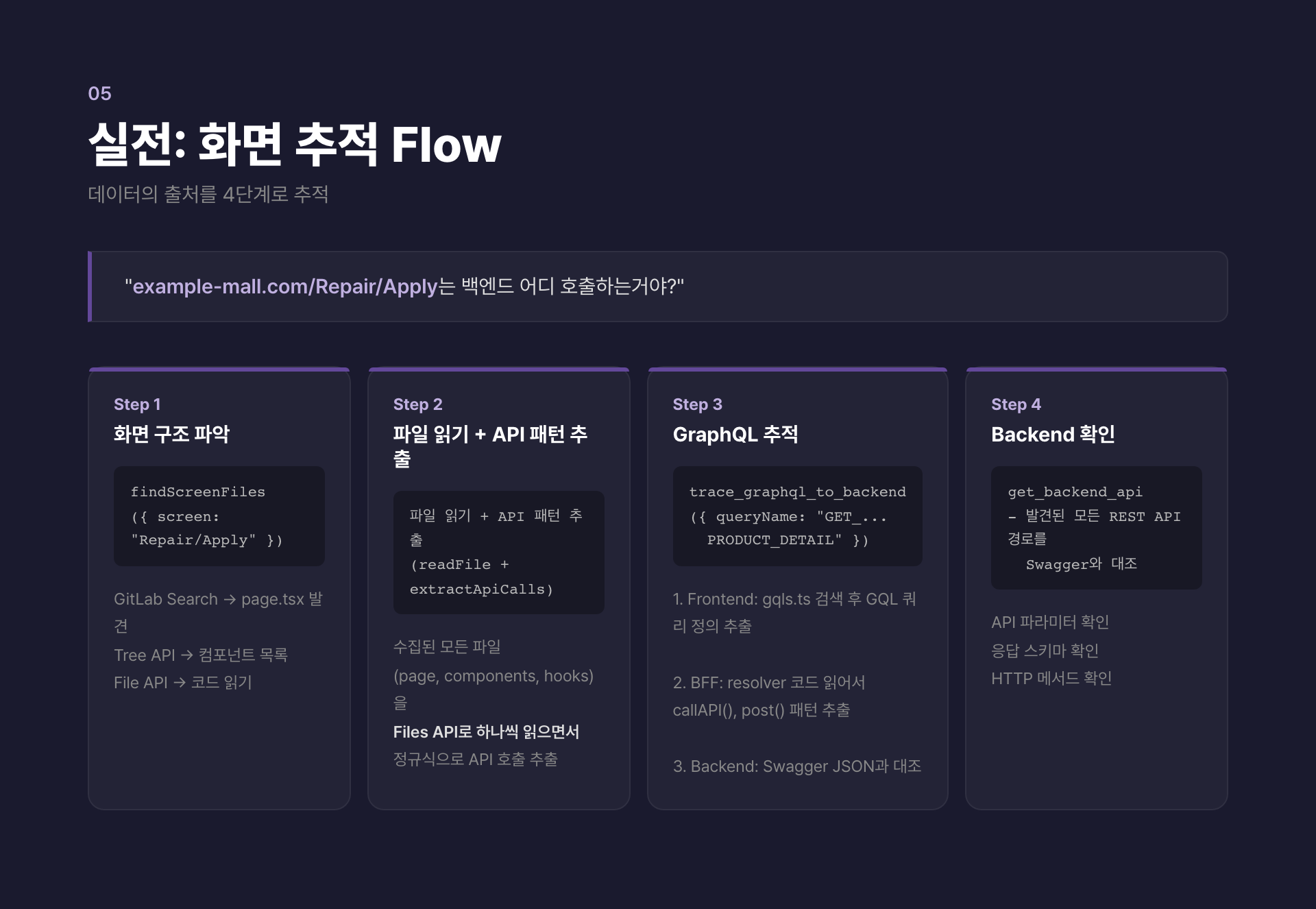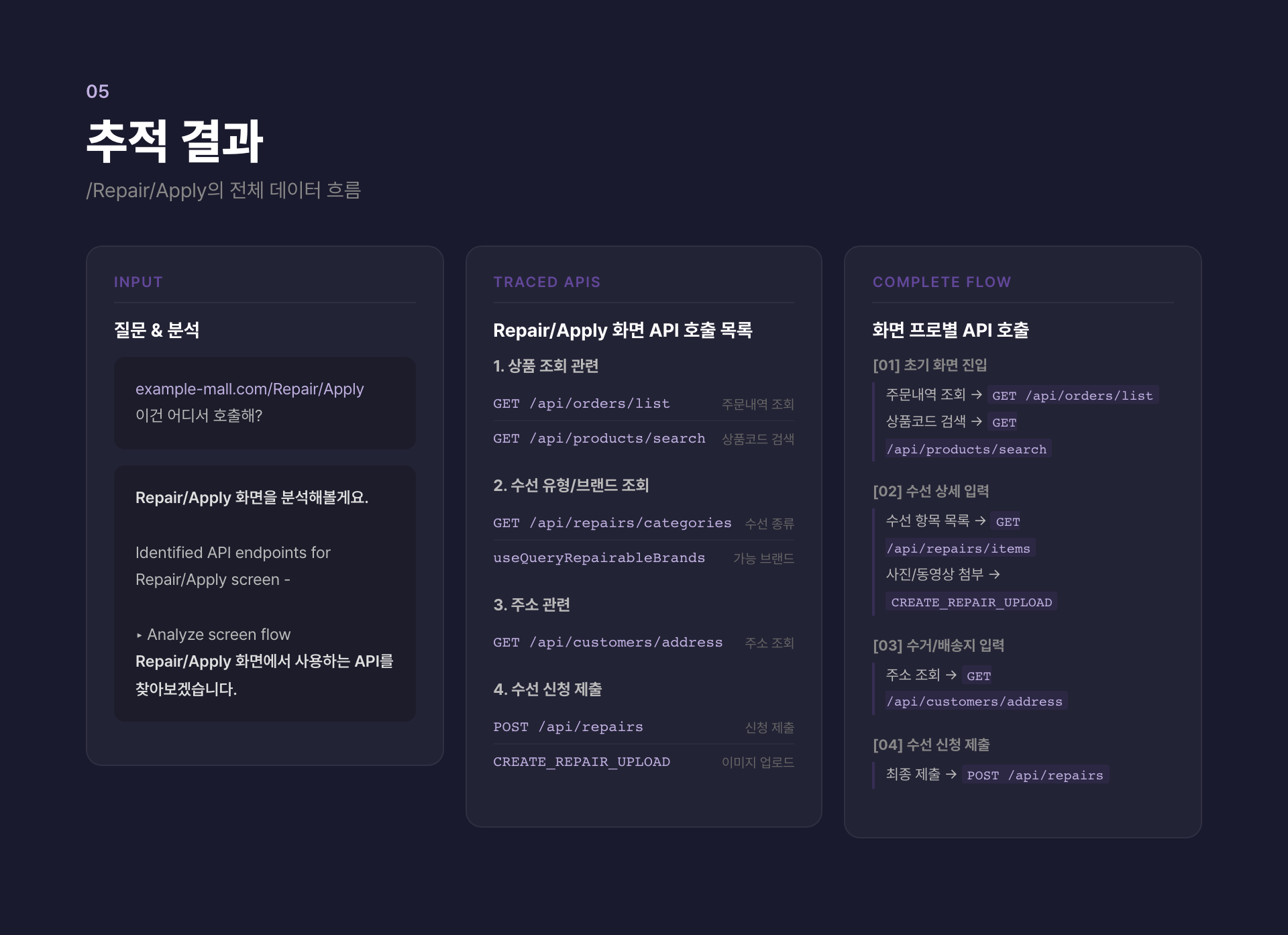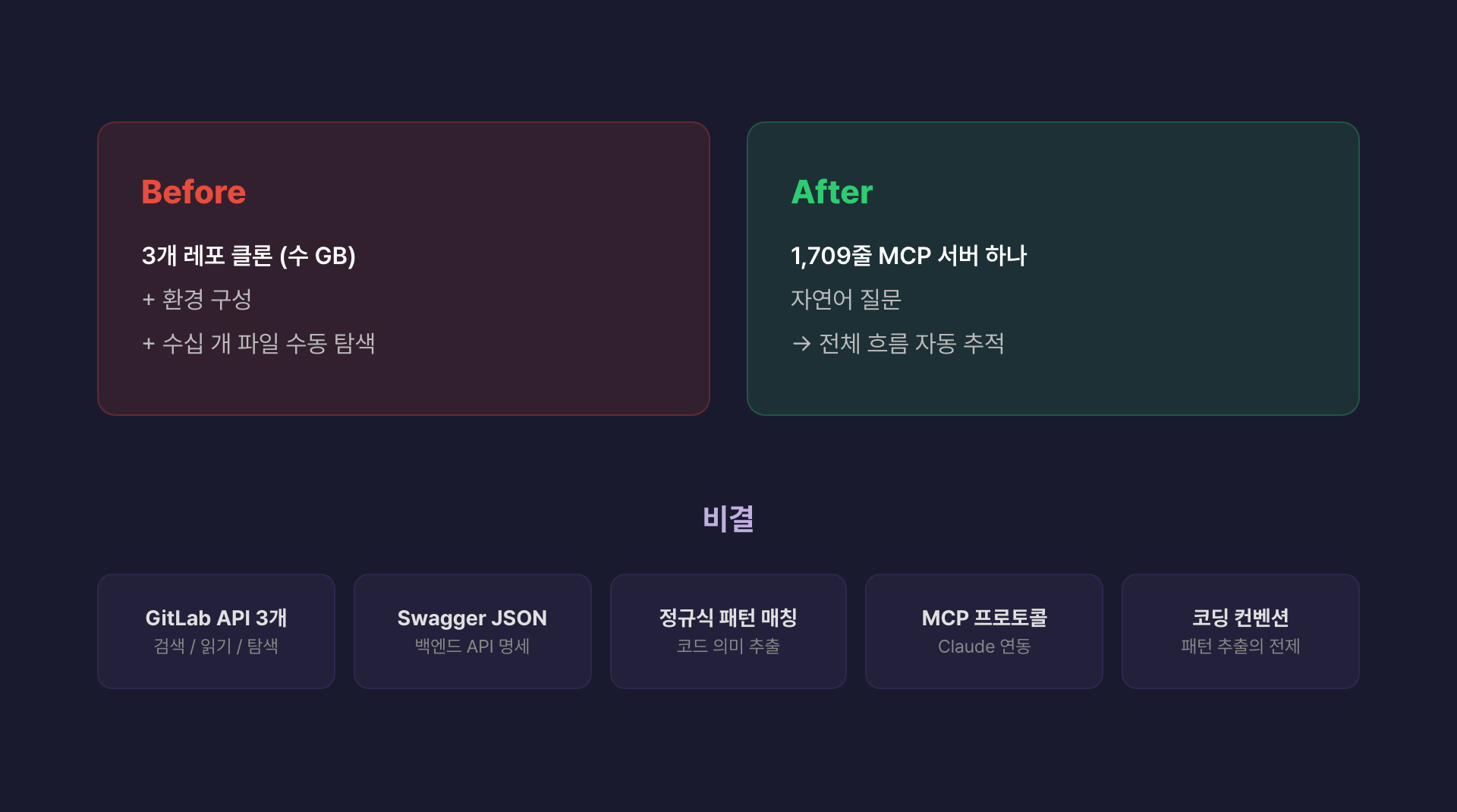 | API 추적 방법 | 3개 레포 클론 + 수십 파일 수동 탐색 | 자연어 질문 → 전체 흐름 자동 추적 |