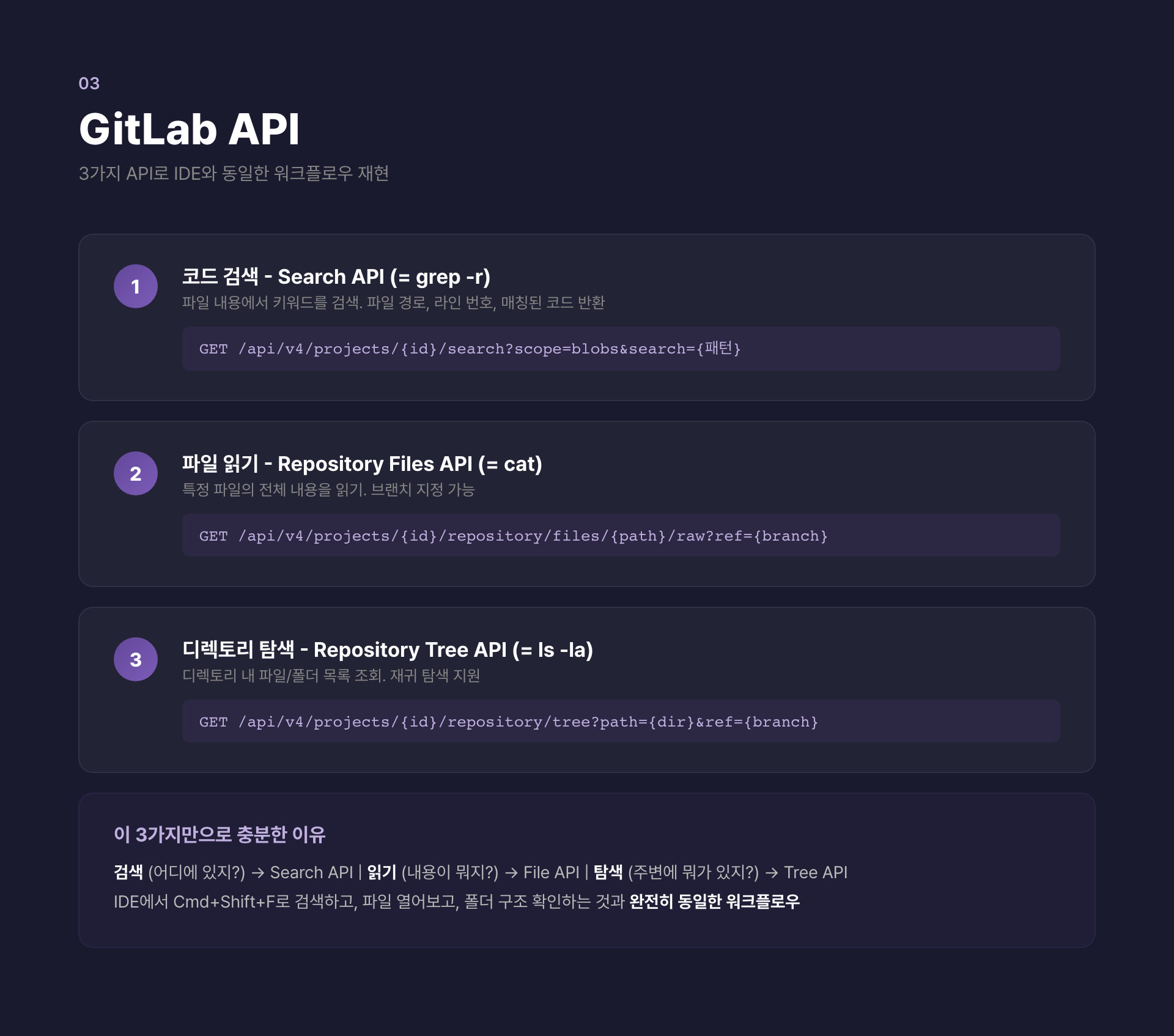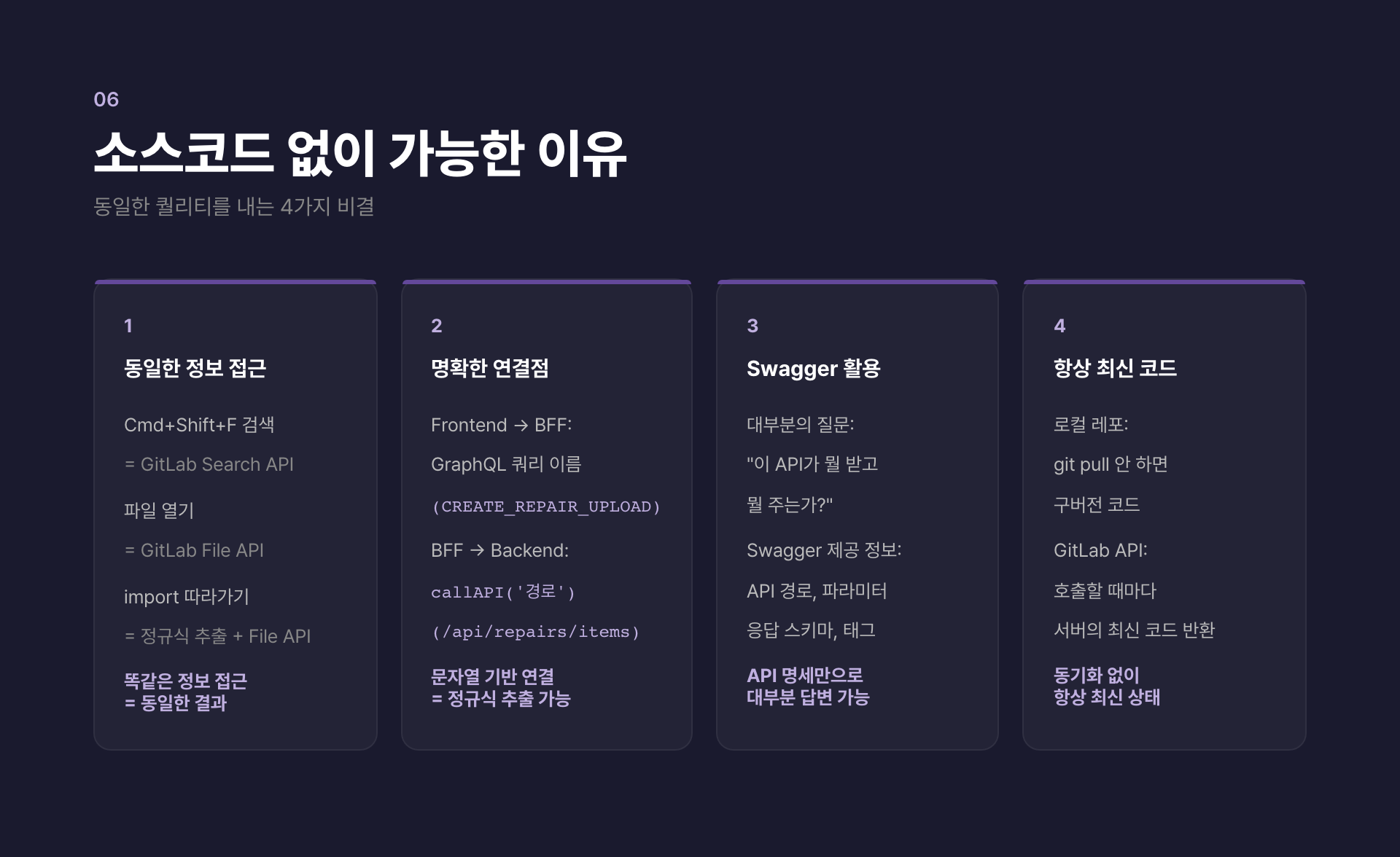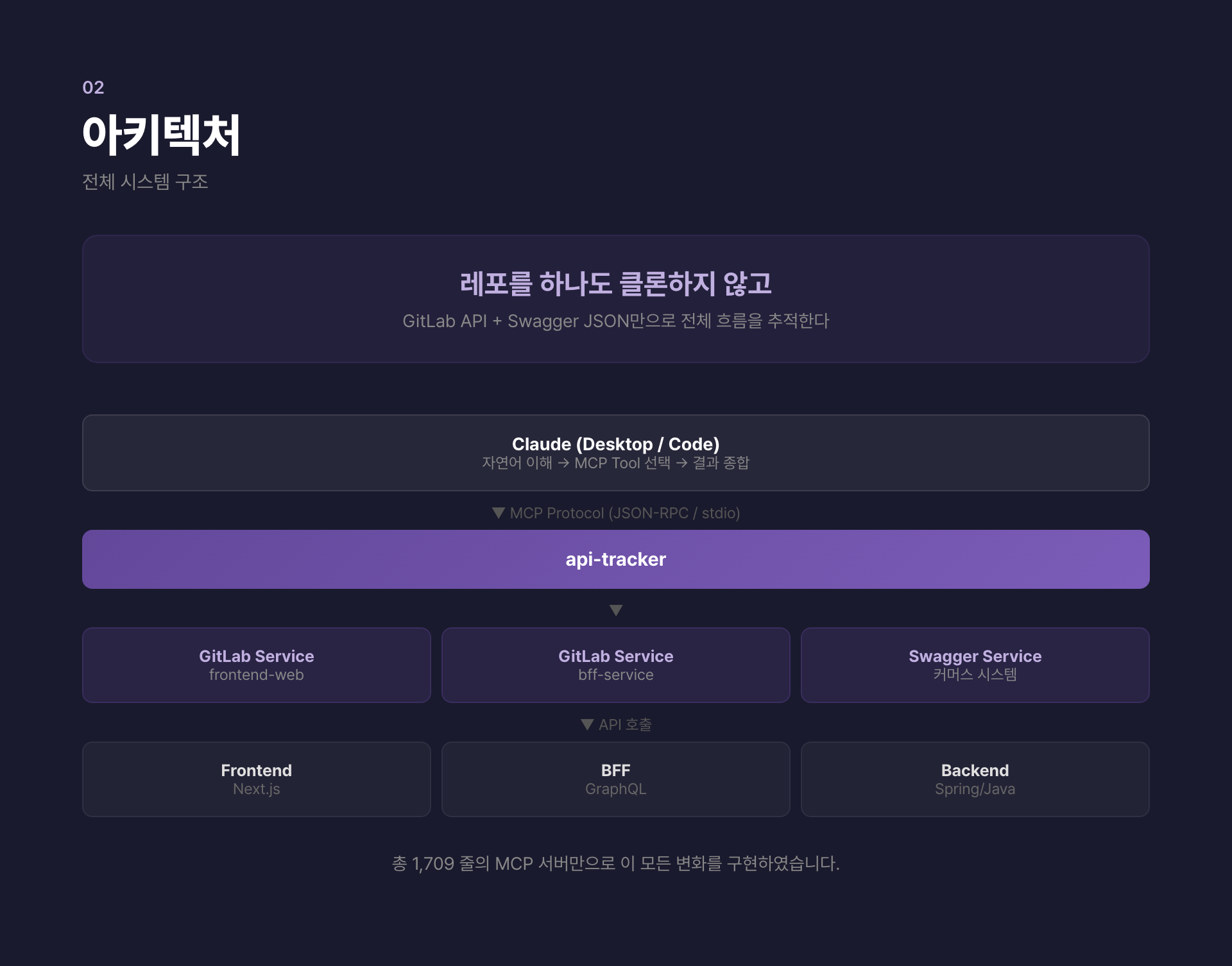 - "Zero-Clone 아키텍처"가 핵심입니다. GitLab API 3가지(Search/File/Tree)만으로 GB 단위 레포를 클론하지 않고 3-Tier 전체를 추적합니다. 문제의 본질(코드 접근)과 수단(클론)을 분리한 발상입니다.