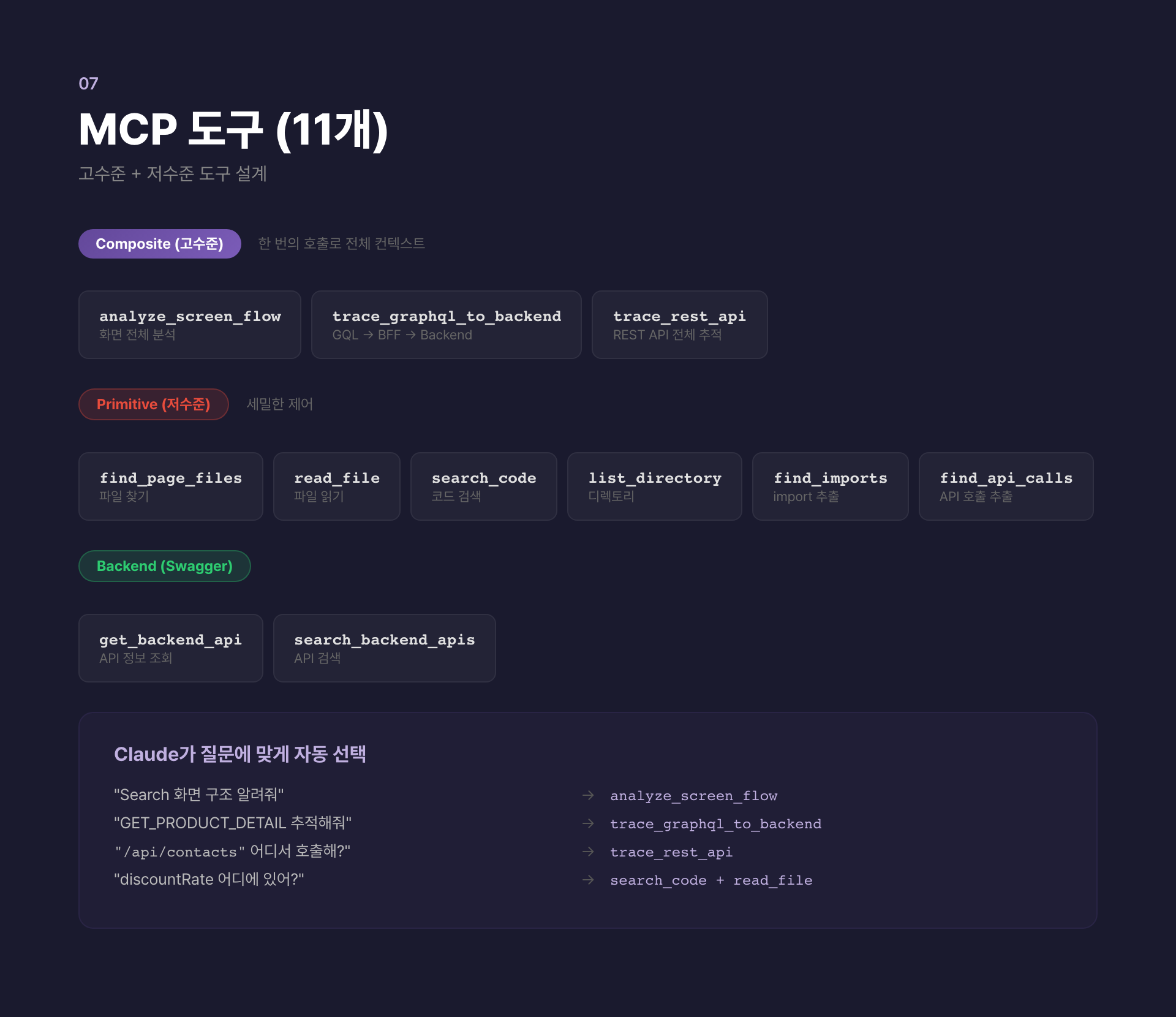 - 1,709줄, 4파일, 의존성 1개 — 절제된 구성입니다. 11개 MCP 도구를 Composite(고수준) + Primitive(저수준) + Backend로 계층화해서, Claude가 큰 질문은 바로 답하고 세부 탐색이 필요하면 저수준 도구로 내려가는 구조를 만들었습니다.