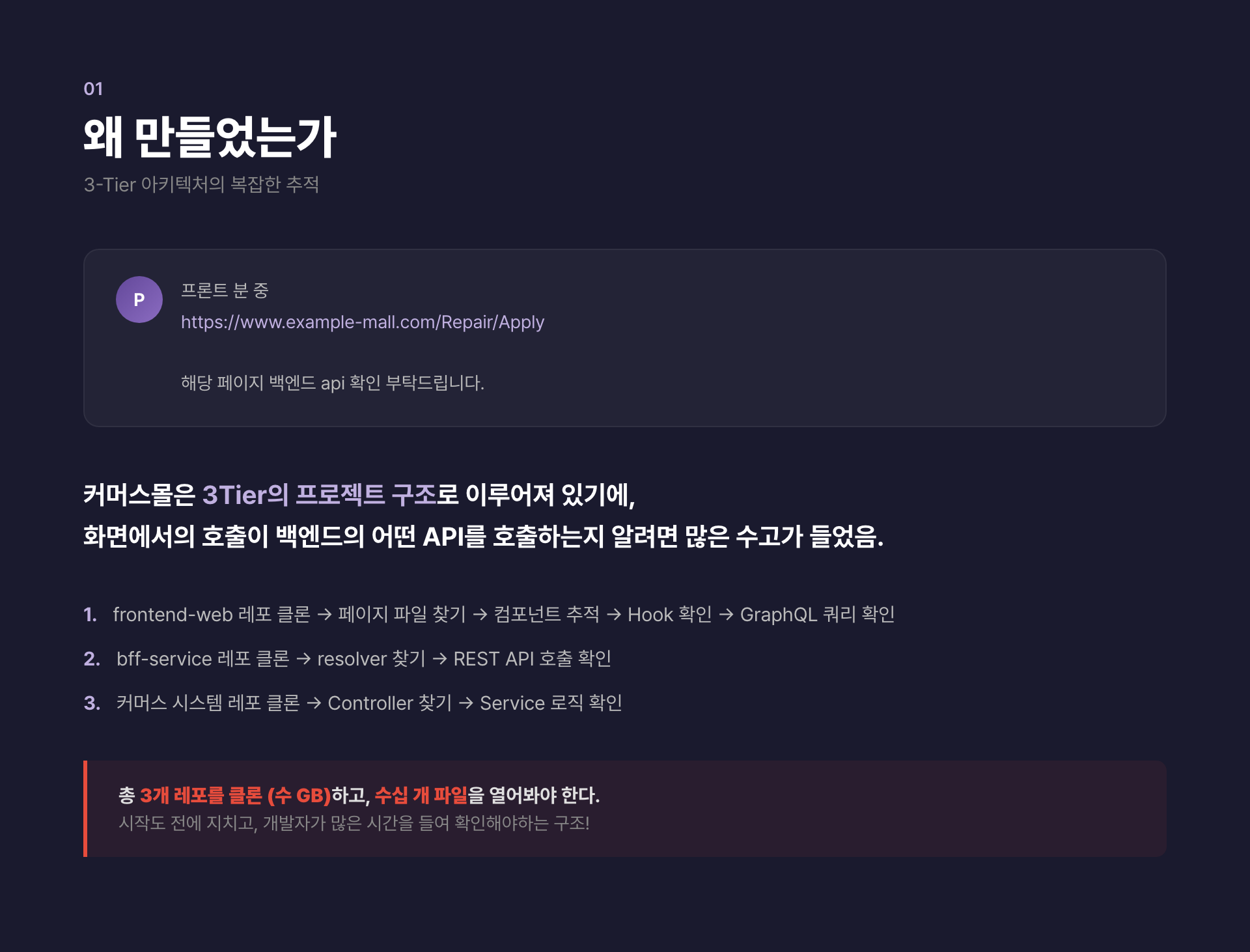 API 흐름을 추적하려면 3개 레포(frontend-web, bff-service, commerce-backend)를 전부 클론하고, 파일을 수십 개씩 열어봐야 했습니다.