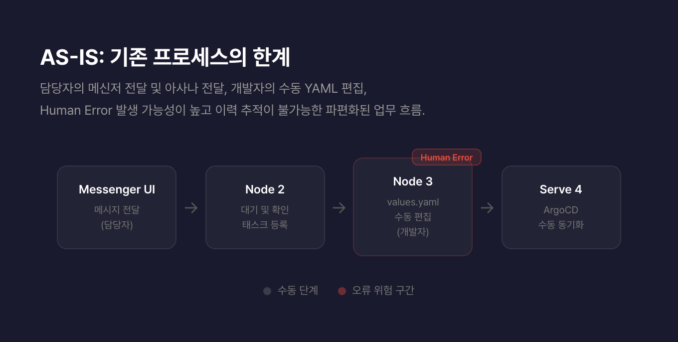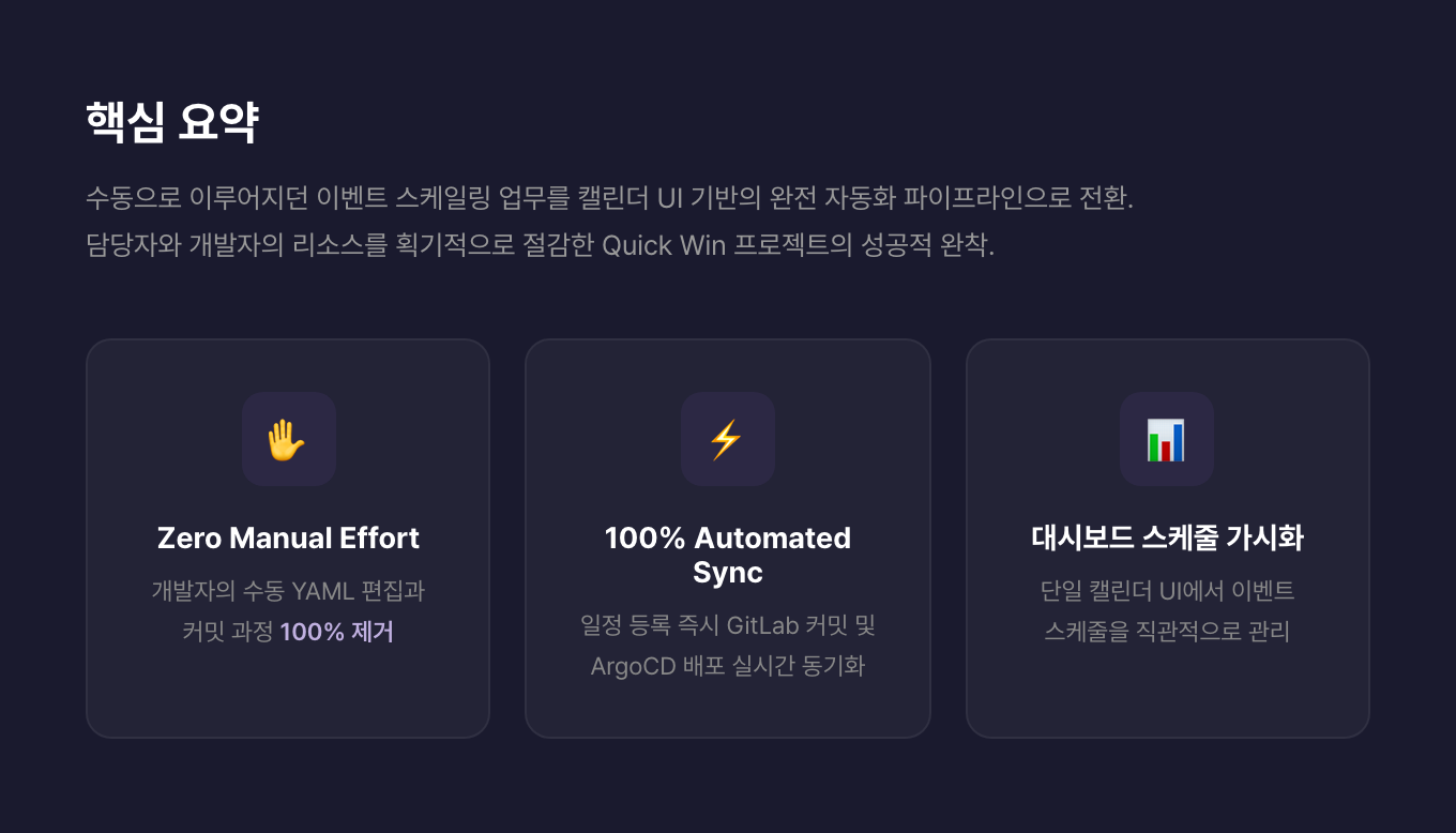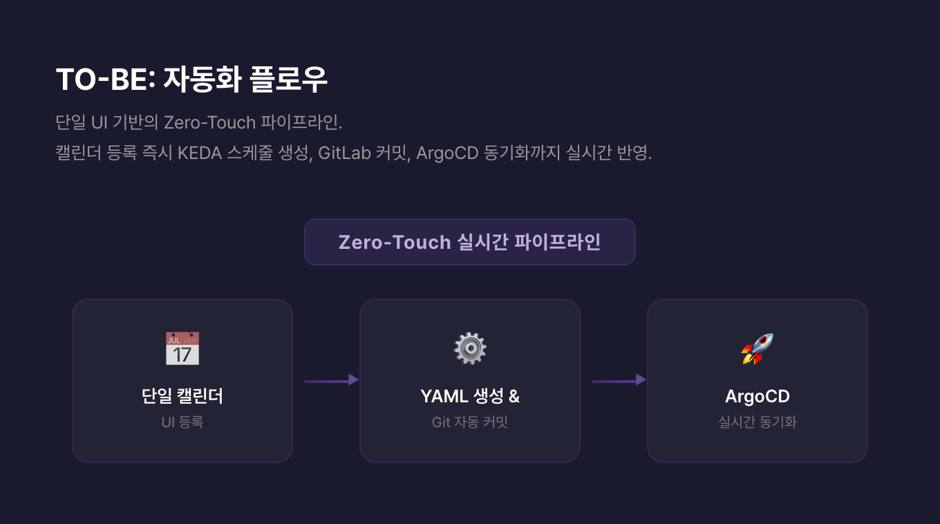 | 수동 작업 | 메신저 전달 → YAML 편집 → 수동 커밋 → ArgoCD 동기화 | 캘린더 UI 등록 1단계 |