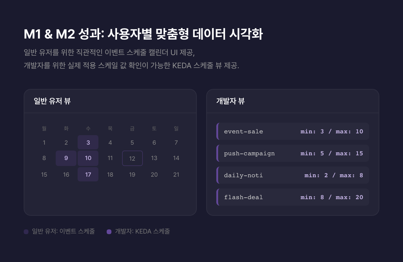 - 단일 캘린더 UI로 마케팅팀과 DevOps팀 모두의 니즈를 해결한 점이 인상적입니다. 같은 대시보드에서 일반 유저용 이벤트 뷰와 개발자용 KEDA 스케줄 뷰를 함께 보여주어, 양쪽의 정보 비대칭을 없앴습니다.