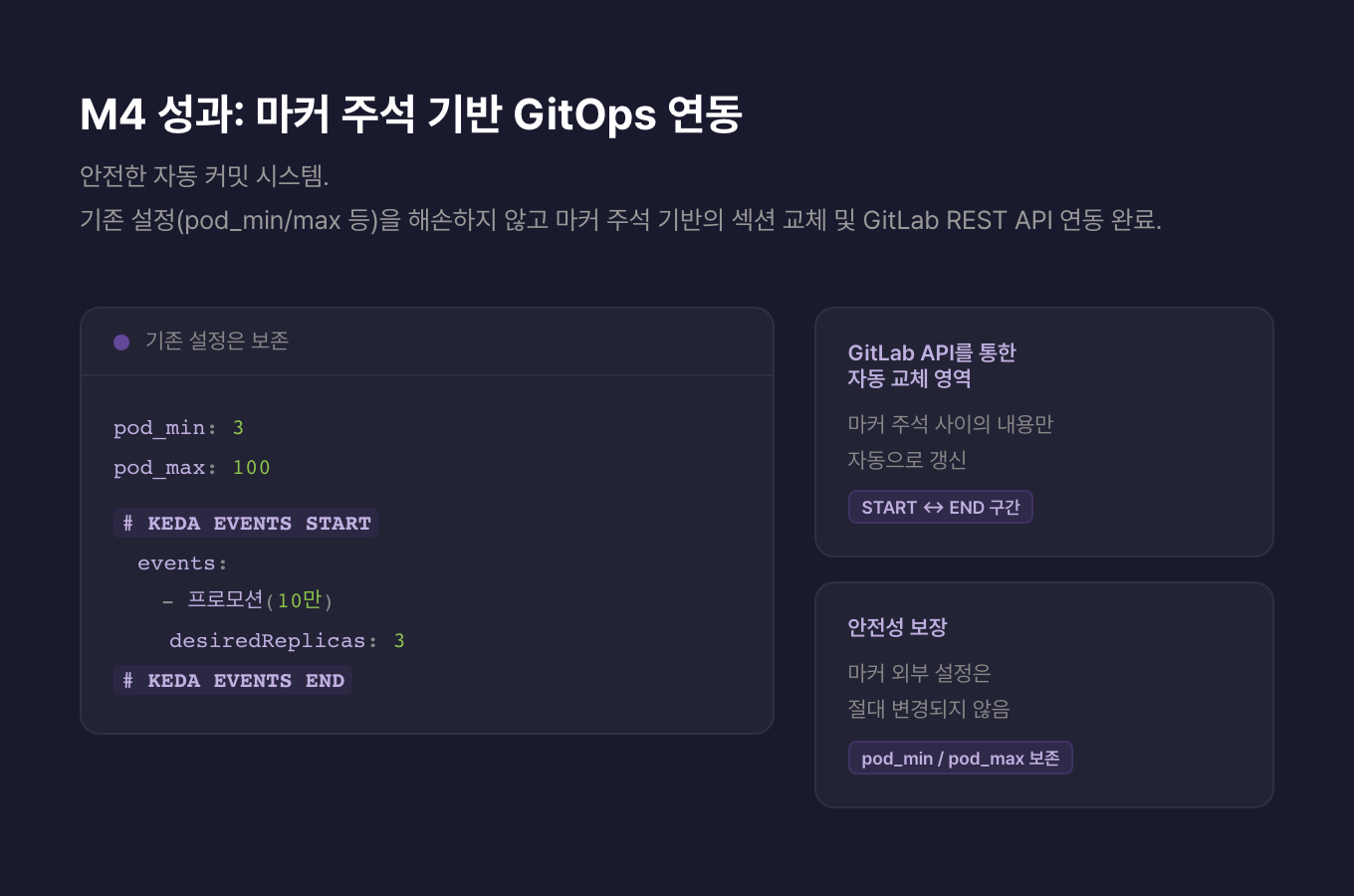 - 마커 주석으로 YAML의 자동 생성 구간만 교체하는 방식이 실용적입니다. 기존 pod_min/max 같은 수동 설정은 그대로 두고 자동화 영역만 안전하게 바꾸는 구조는, 이미 돌아가는 인프라와 충돌 없이 공존할 수 있게 합니다.