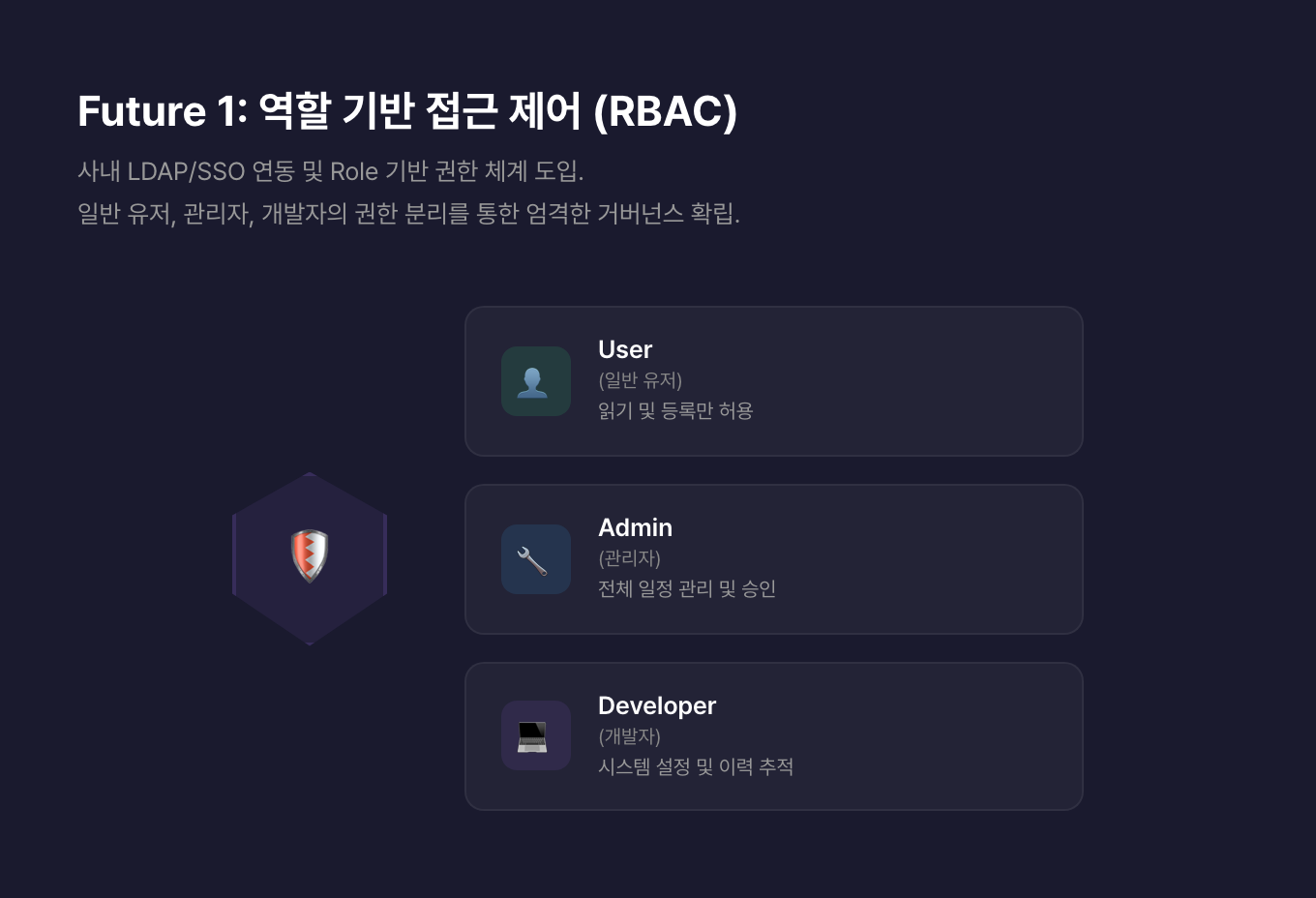 사내 LDAP/SSO와 연동하고 역할별 권한 체계를 도입해, 일반 유저·관리자·개발자의 권한을 분리할 계획입니다.